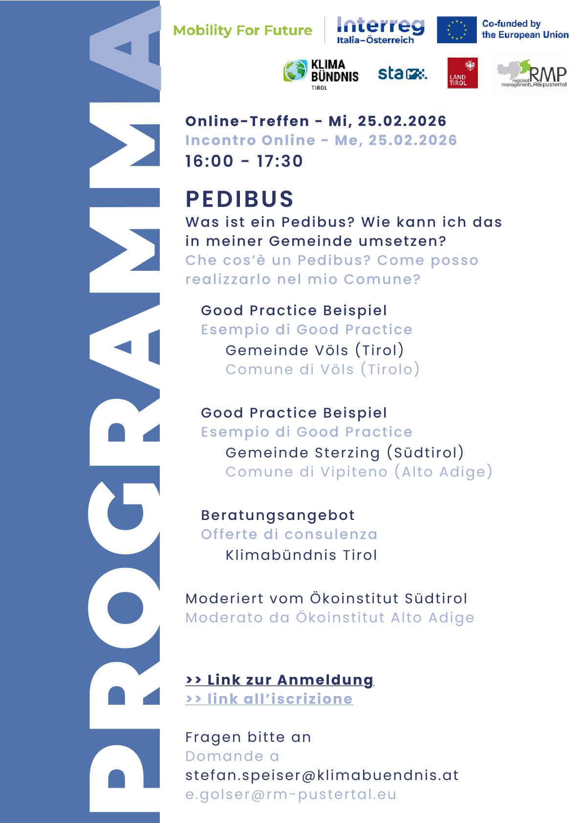 Im Rahmen eines Online-Treffens am Mittwoch, 25. Februar 2026, von 16:00 bis 17:30 Uhr stellen die Gemeinden Völs (Tirol) und Sterzing (Südtirol) ihre Erfahrungen mit dem Pedibus als Good-Practice-Beispiel vor. Ergänzt wird das Programm durch ein Beratungsangebot des Klimabündnis Tirol.